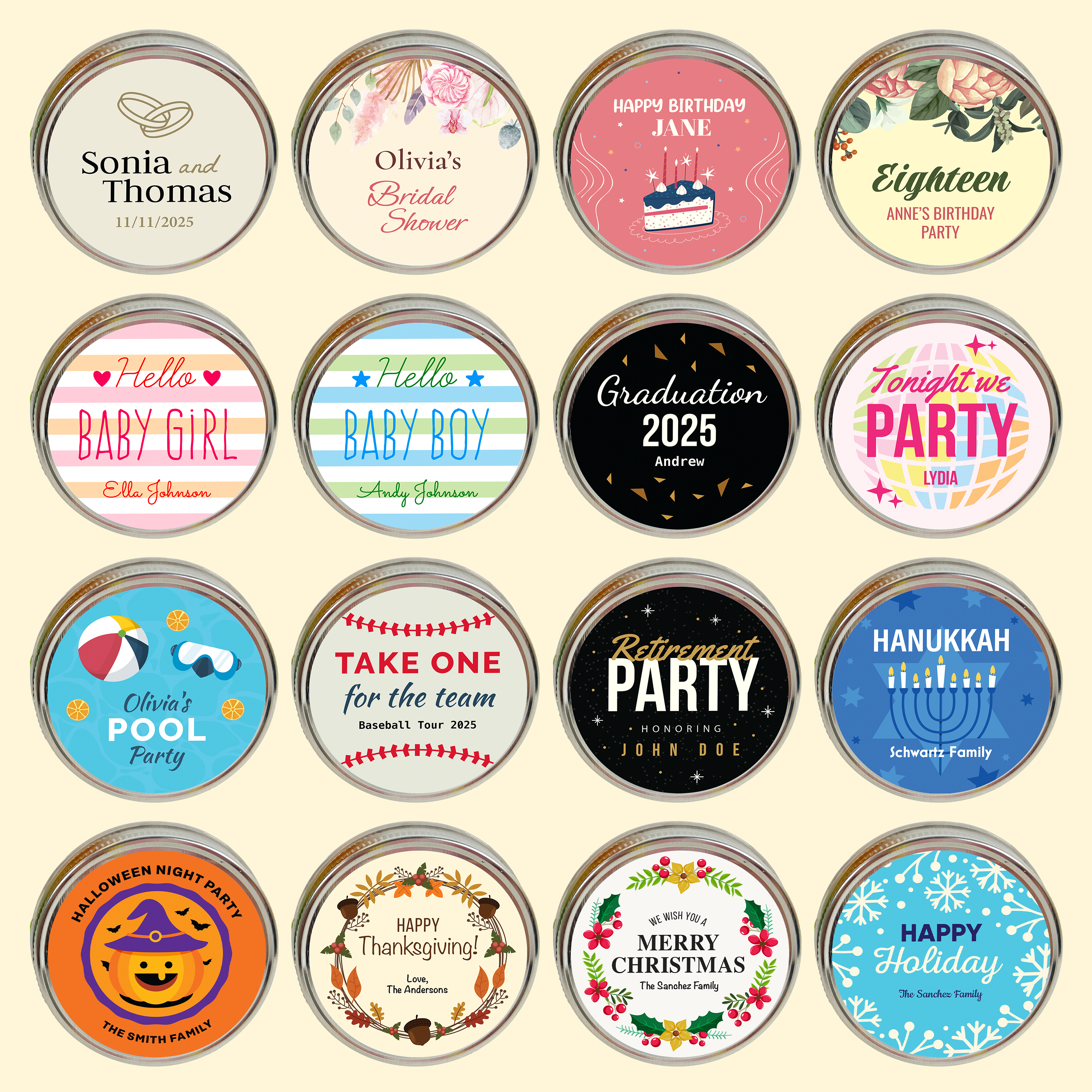 Elevate your cupcake jars with our beautifully crafted, customizable Cupcake Jar Lid Labels. Perfect for party favors, gifts or business branding. Each design can be personalized and tailored to complement your event’s color palette. We also offer the option to feature your logo.