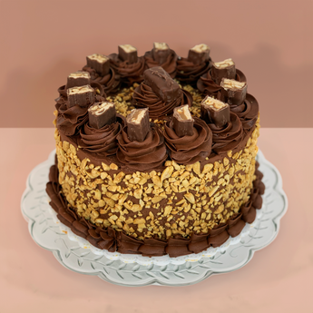 Snickers are the hearty candy bar that satisfies hunger cravings. The Snickers Cake takes indulgence to a new level! Order this chocolate cake with layers of chocolate buttercream, caramel filling and toasted almonds and have it delivered to your next birthday party or special event. The cake is frosted with chocolate buttercream with toasted almonds on the side. Topped with chocolate buttercream and Snickers bars.